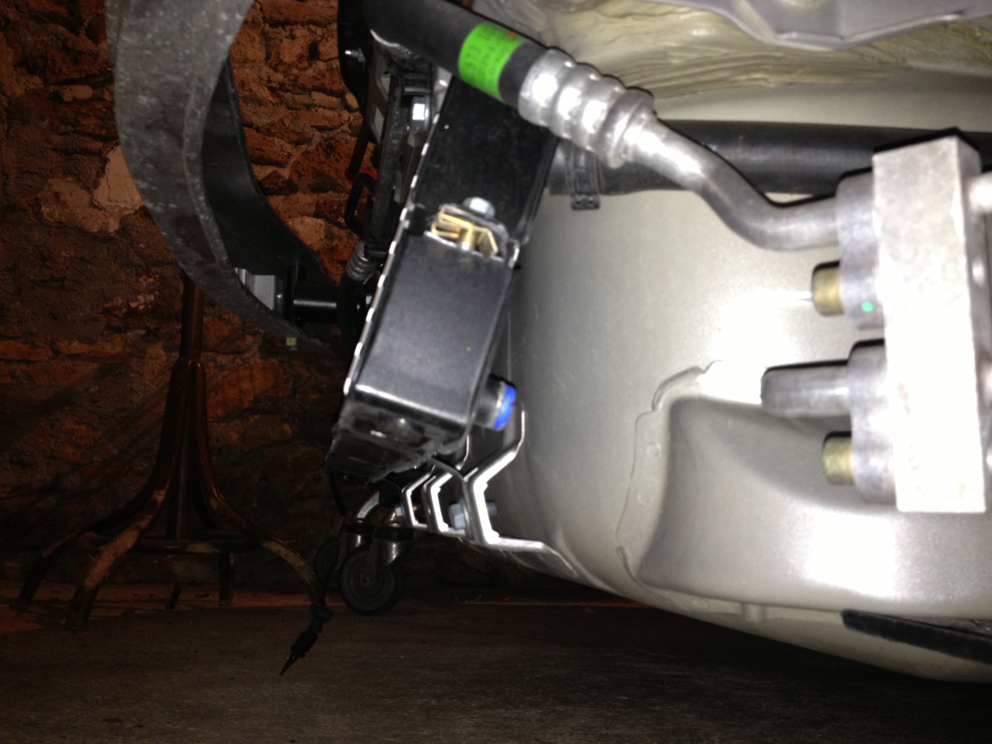 Rien de tres compliqué en somme, le radiateur est fixé au logement de coffre, directement en haut, via des pattes en bas; "suffit" de faire des pattes plus longues pour le haut ce qui va l'avancer et le pencher en avant, de modifier l'écope d'entrée, et de mettre une tôle/écope derrière.