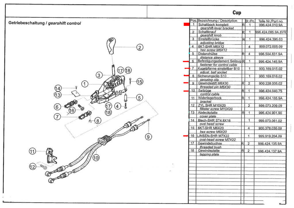 "In order to correctly and safely install the cup cables with the oem 996 shifters or 997 shifters or 996 cup shifter you need the parts marked with red on the attached diagram: