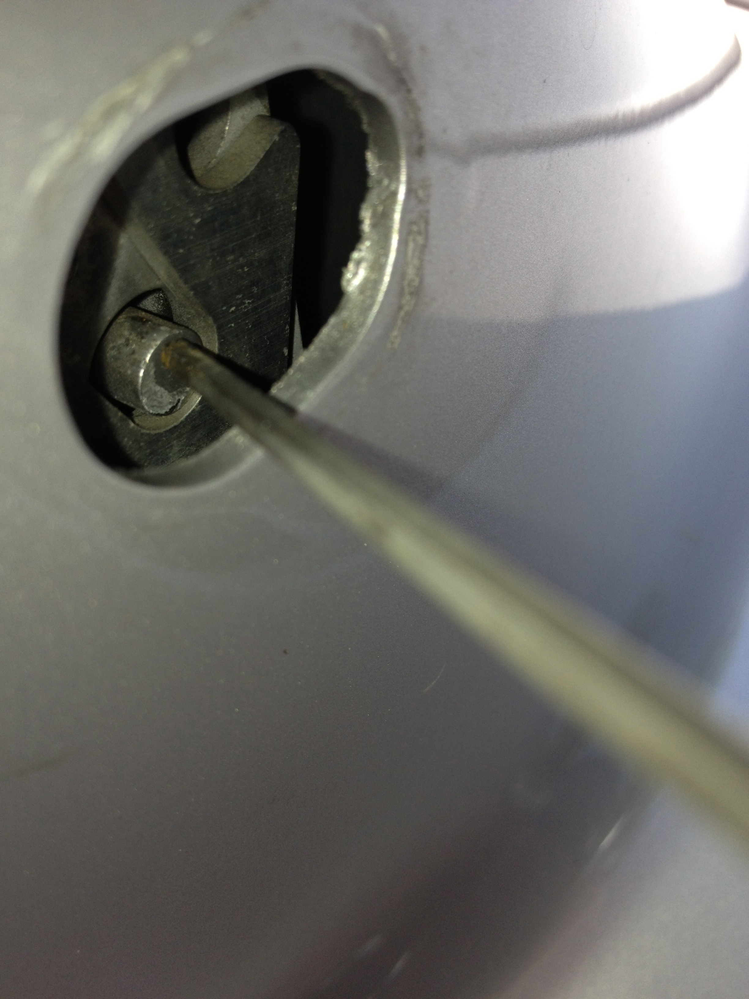 Gaffe à pas faire tomber la rondelle dans le pilier... mais celui ci communique avec la doublure de capot, donc cela reste accessible.