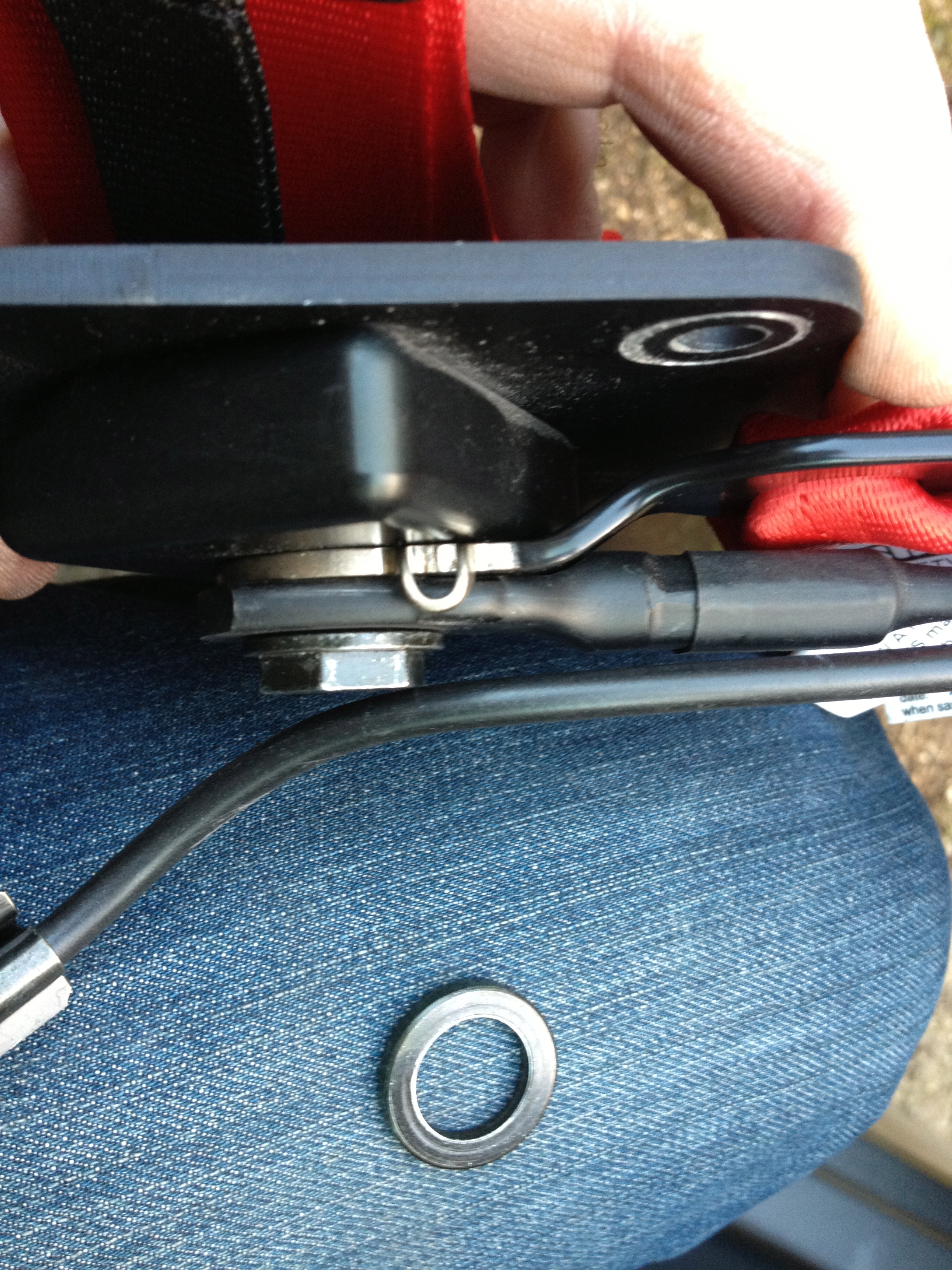 On passe les sangles dans le trou du baquet... et oui, le boitier de harnais passe pas par le trou!